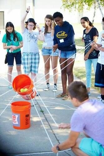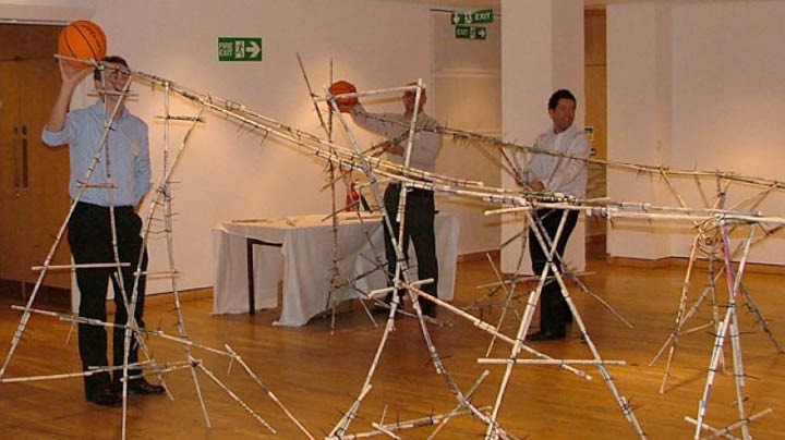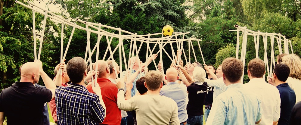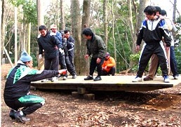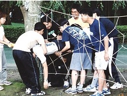巨大なくもの巣に見立てたロープを張ったエレメントを利用し、そのロープに触らないように全員がくぐり抜けます。ロープに触ってしまったら全員が元に戻り再スタートとなります。くもの巣の穴は、形、高さ、大きさがさまざまで、メンバー全員の協働と知恵、リーダーシップ、集中力が求められます。