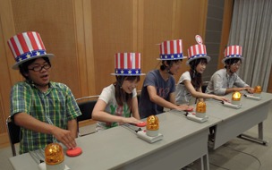 簡単に来場者全員を巻き込む参加型イベントが実現!クイズ画面は「オールスター感謝祭」のさながら、4択式です。出題→解答→正解発表→4問の解答率分布棒グラフ表示という一問一答方式です。