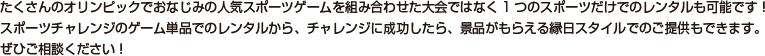 もちろん大丈夫です。スポーツゲームを縁日のように、成功したら景品をプレゼント!というシステムにして運営させていただく実績も多数ございます。種目も沢山ございますので、ぜひご相談ください。