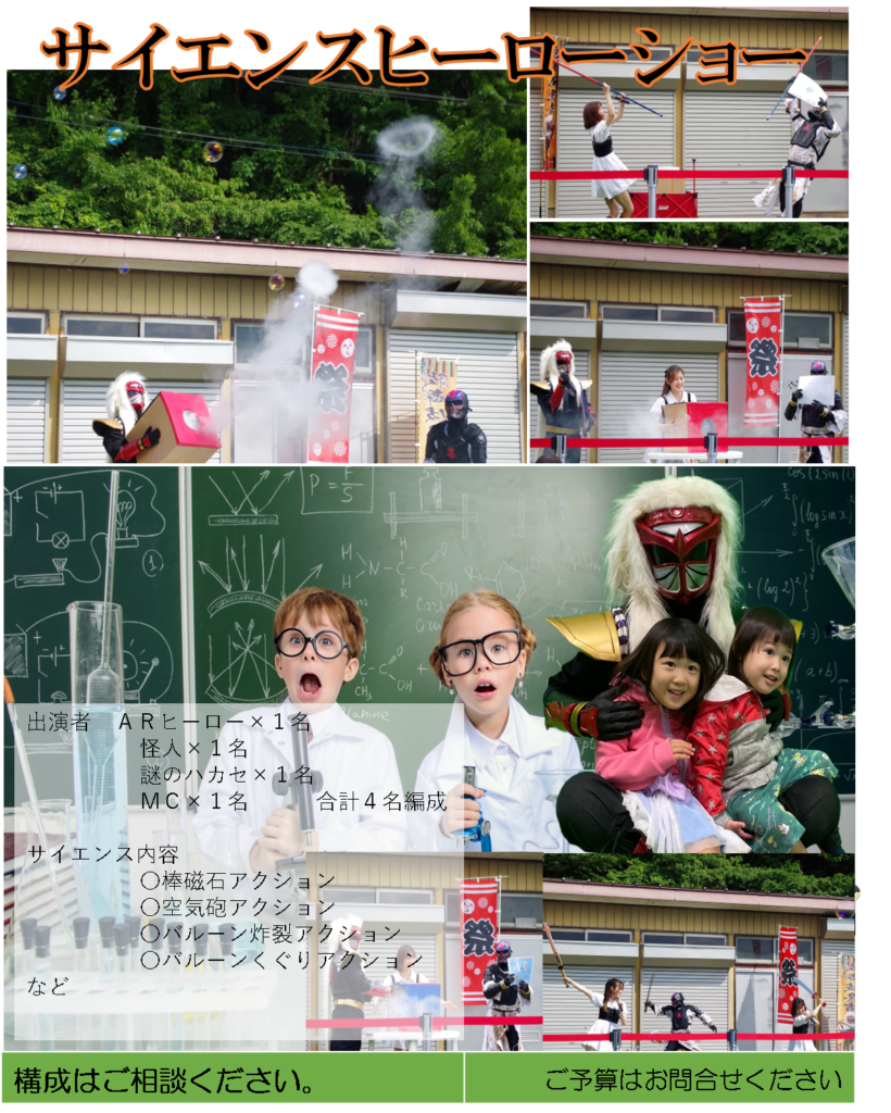 ショー中で、その日初めて見るような人だと、子供たちの中には萎縮してしまう子であったり、実験を見るだけではあまりテンションが上がらないという子もいるかもしれません。そういう時にヒーローの出番です。子供なら誰もが知るような、テレビでよく見るヒーローに対面することで、付加価値的にショーを楽しめるようになります。子供にとってヒーローとはそれほど大きい存在なのです。